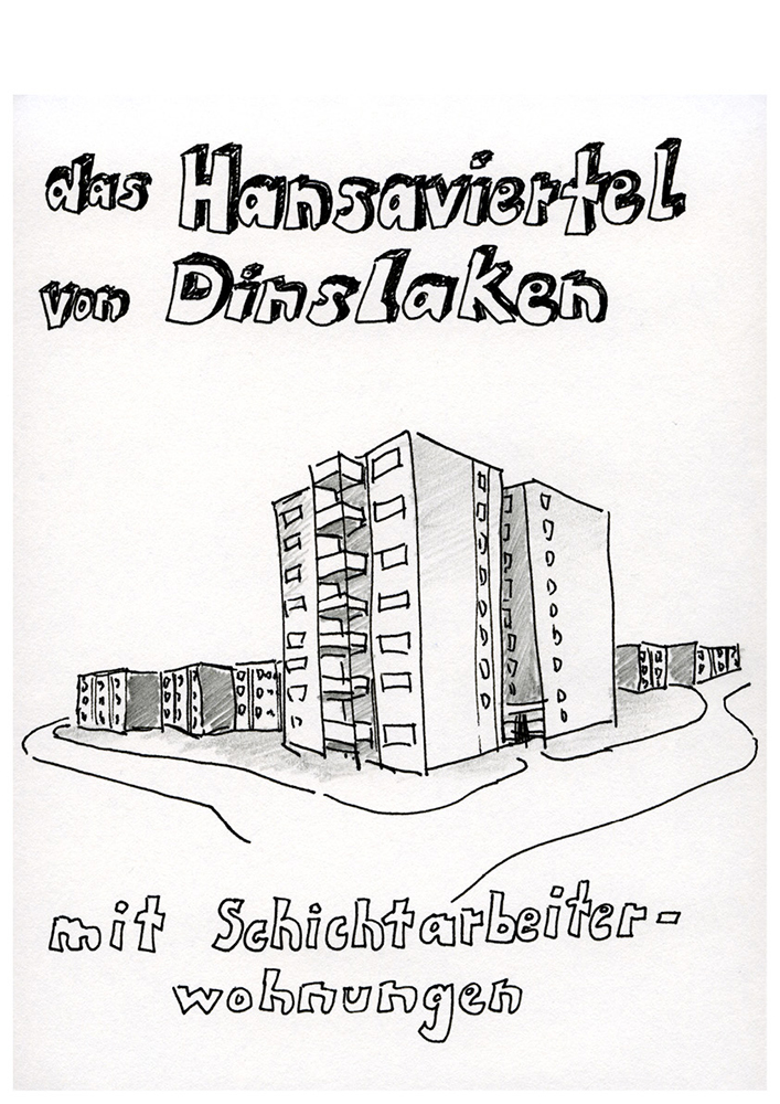 “August-Thyssen-Siedlung, erbaut 1966, moderne Mietwohnungsanlage aus den 1960er Jahren mit Punkthochhäusern, 4-geschossigen Wohnhäusern und Bungalows … das Hansaviertel von Dinslaken” 2015