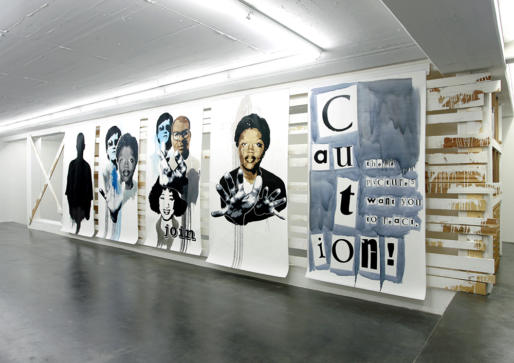 wooden structure, paint, 5 “Proclamation Posters”, oil on primed paper