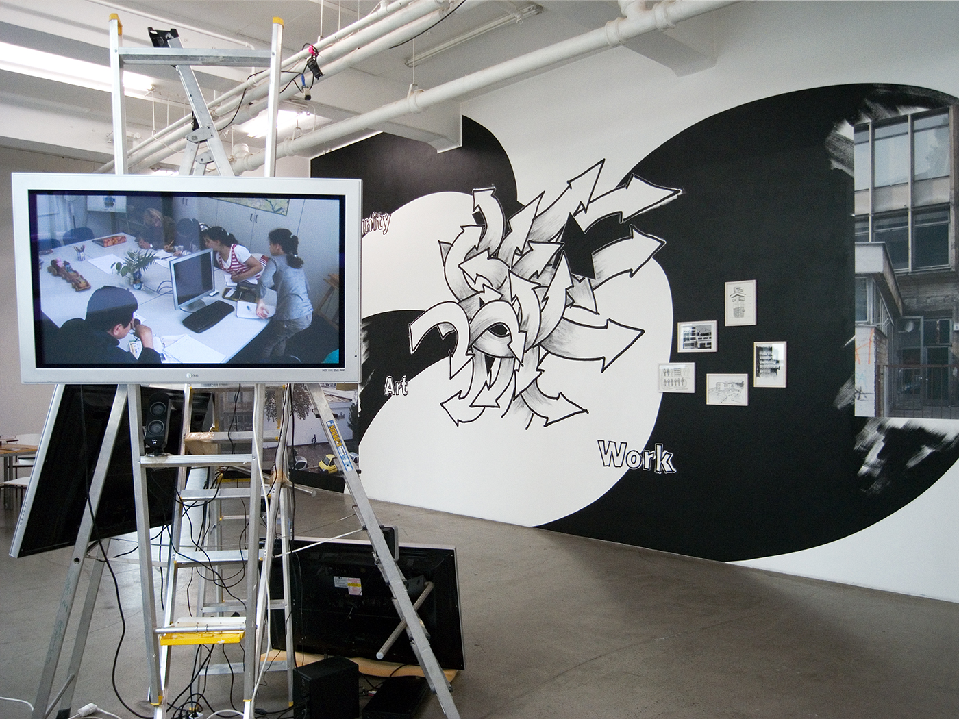 billborad prints, wall painting, drawings, posters, sculpture with leathers and monitors, slide projections, info material
